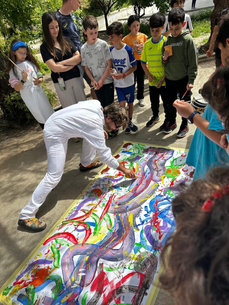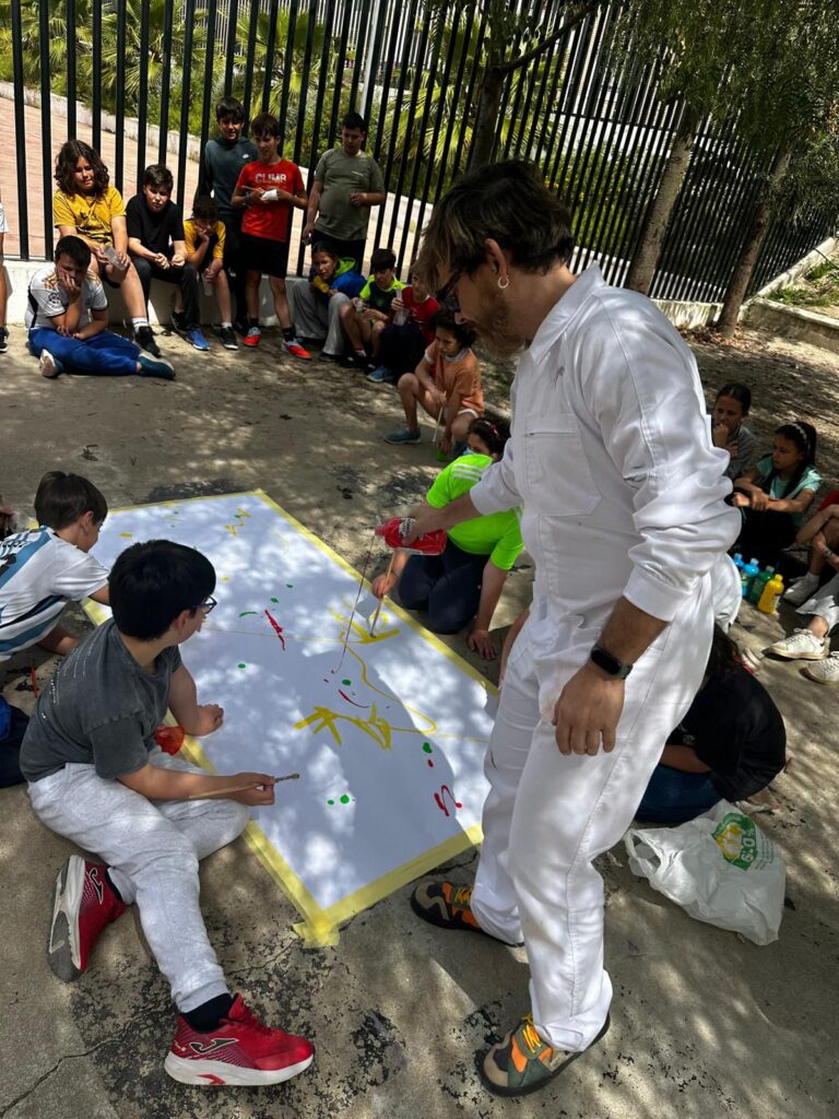 La primera parte de la formación técnica estuvo dedicada al primer ciclo de Primaria e Infantil. Con los más pequeños, Aroca se centró en conceptos básicos pero fascinantes, como la mezcla de colores. Para captar su atención, utilizó tintas especiales que cambiaban de tonalidad al combinarse, creando un efecto casi mágico para los niños. La sesión culminó con la creación de dos obras colectivas en las que participó todo el alumnado de este ciclo, aplicando los conocimientos recién adquiridos.